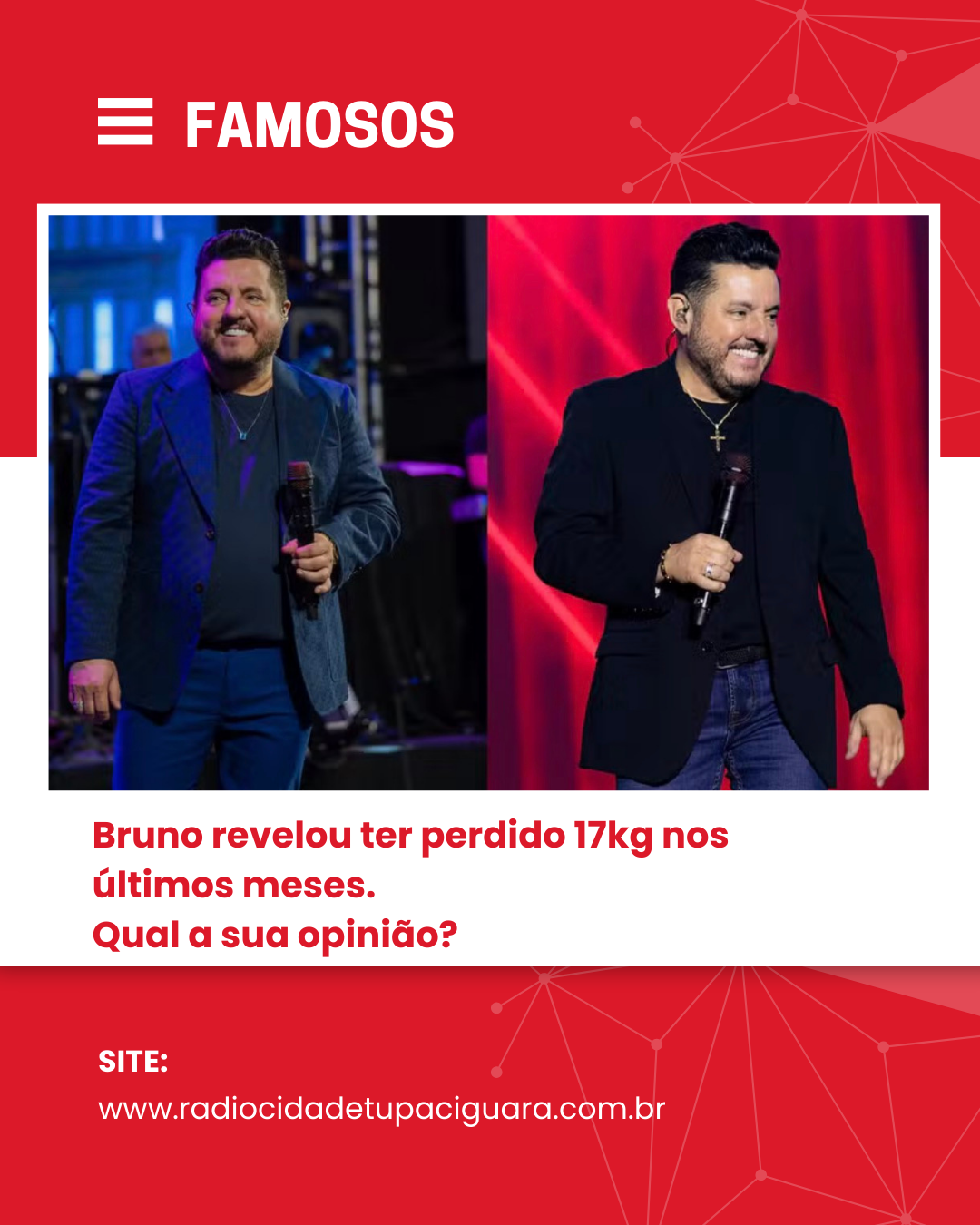 Bruno, da dupla com Marrone, revelou ter perdido 17 kg nos últimos meses para voltar a vestir as roupas que tanto gostava — e disse que a mudança “melhora tudo”!